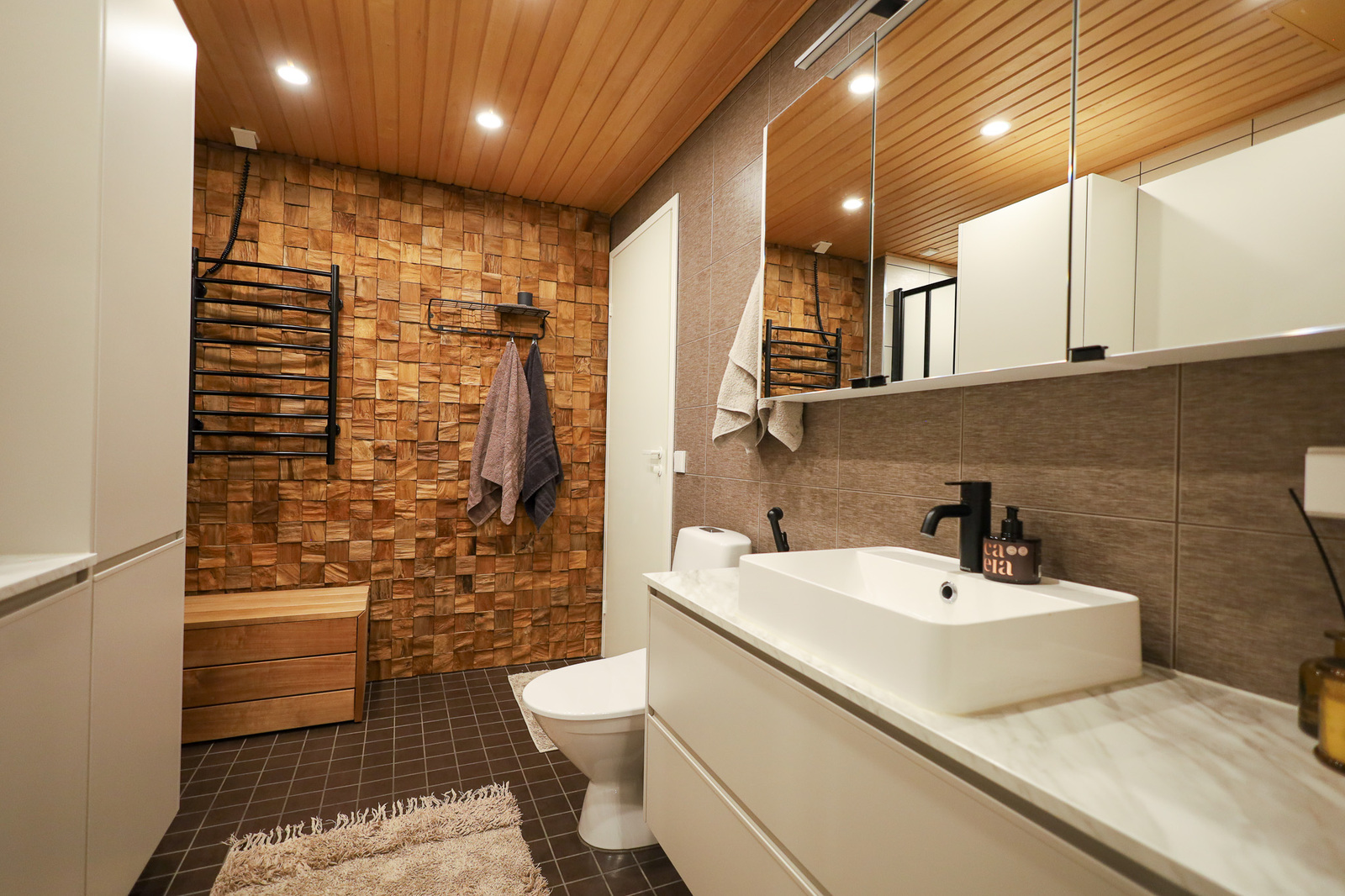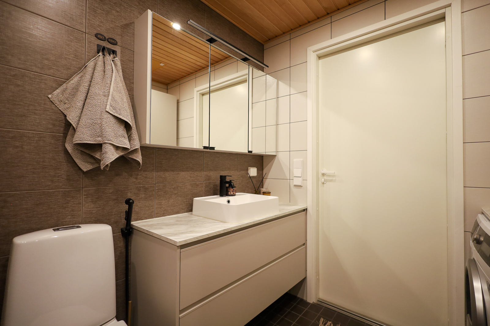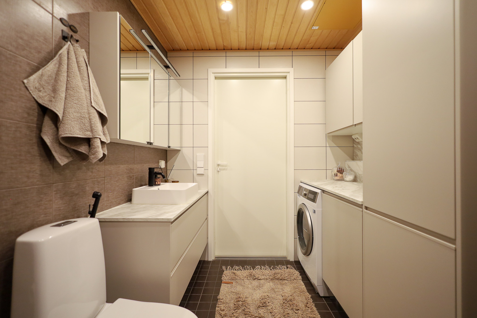 Suihkuseinä, pesukoneliitäntä, lattialämmitys, wc-istuin, suihku, kylpyhuonekaapisto