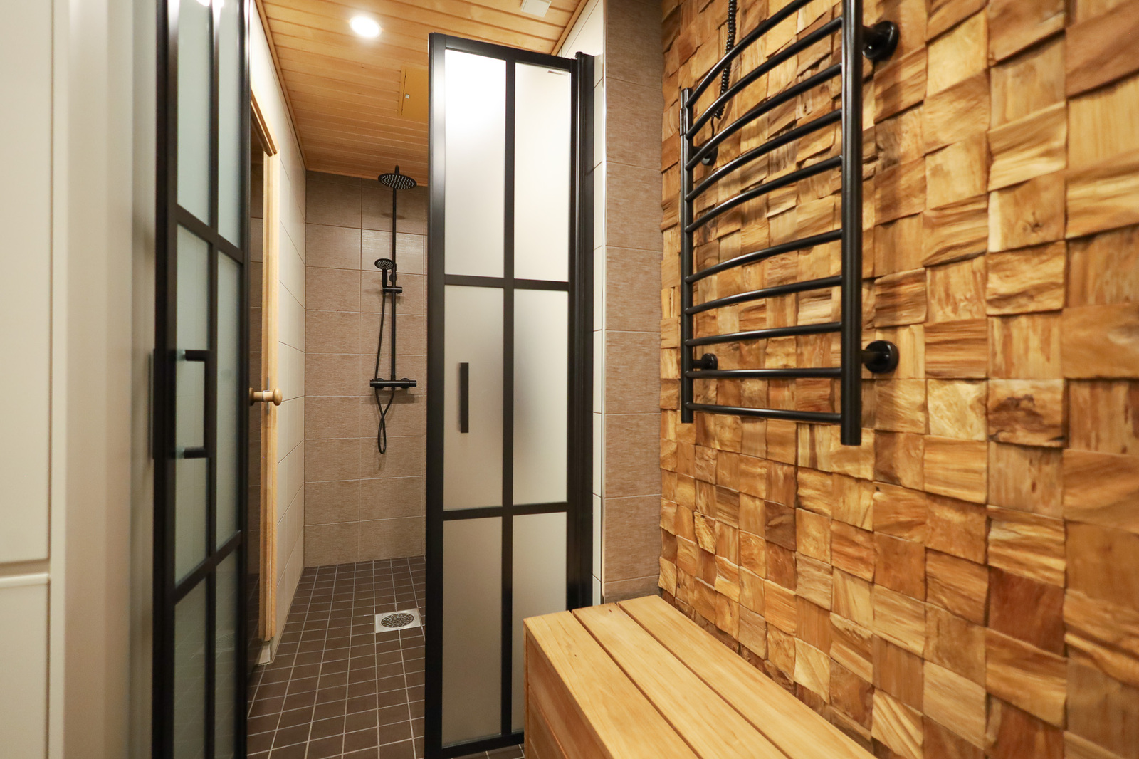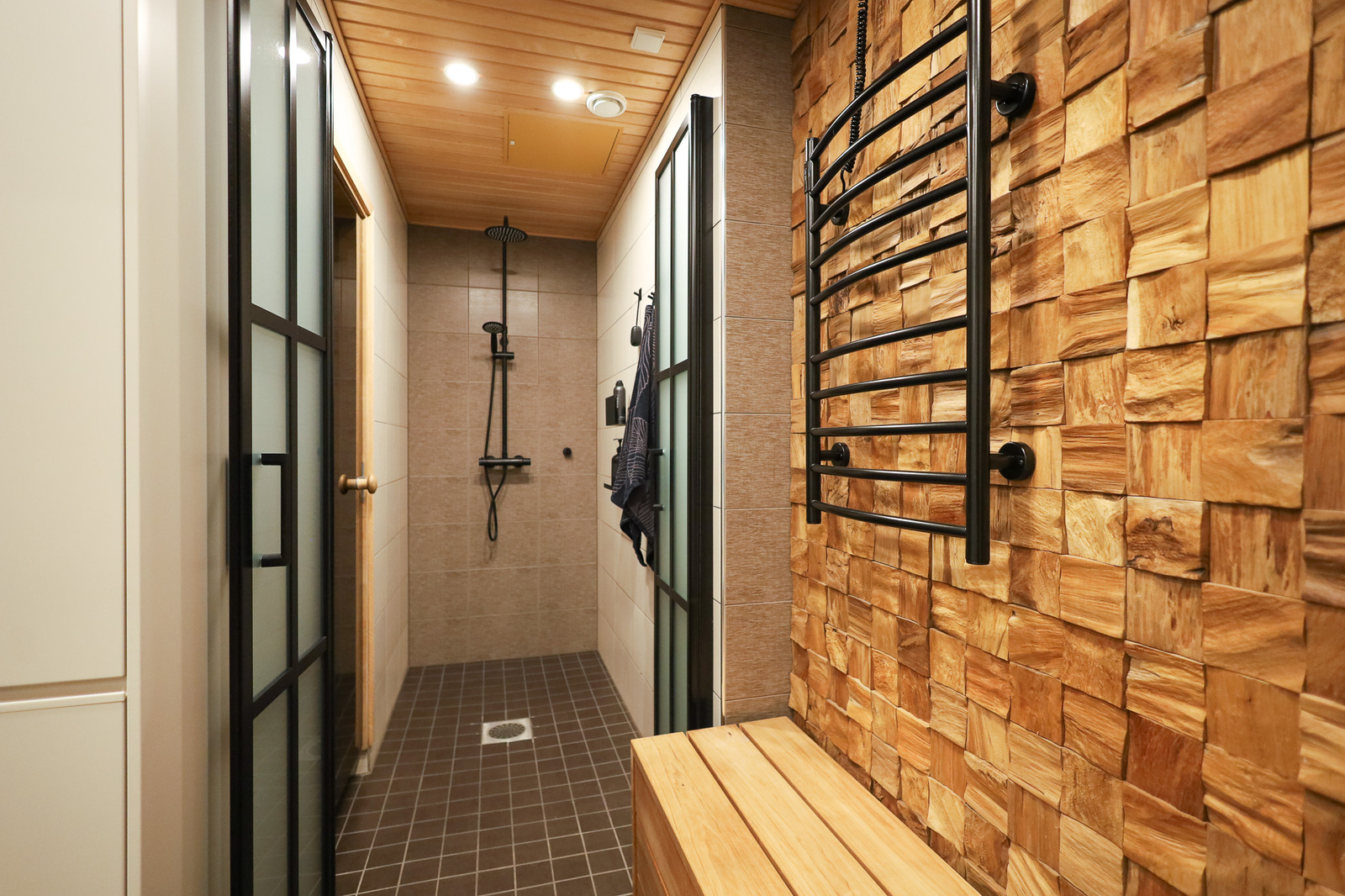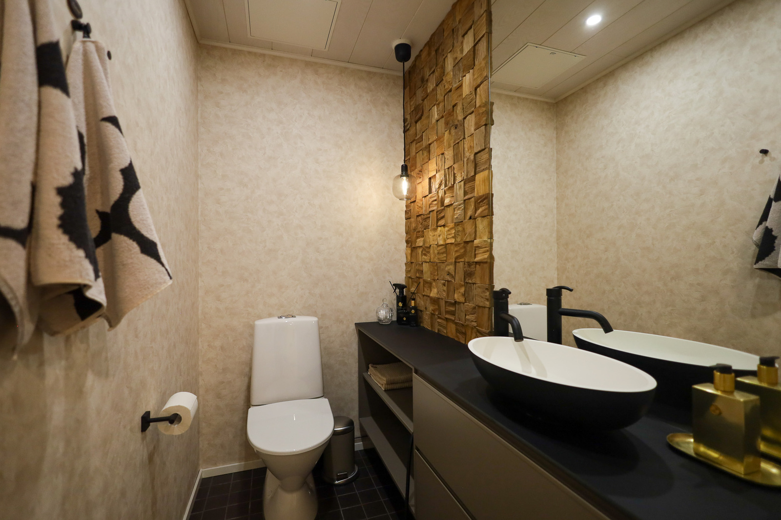 Suihkuseinä, pesukoneliitäntä, lattialämmitys, wc-istuin, suihku, kylpyhuonekaapisto