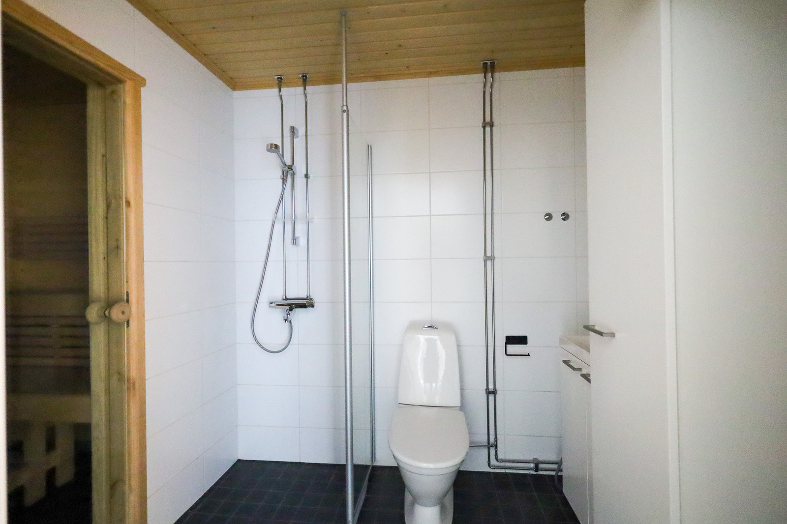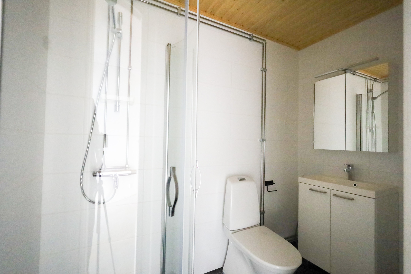 Suihkuseinä, pesukoneliitäntä, lattialämmitys, wc-istuin, suihku, peilikaappi