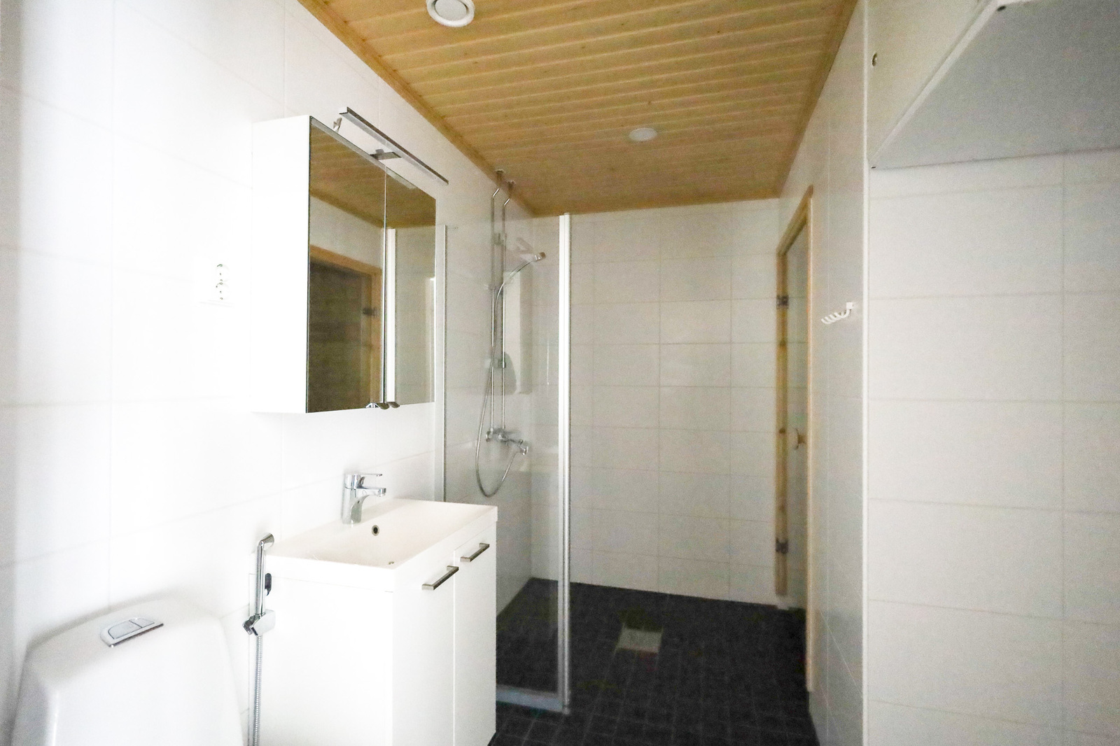 Suihkuseinä, pesukoneliitäntä, lattialämmitys, wc-istuin, suihku, peilikaappi