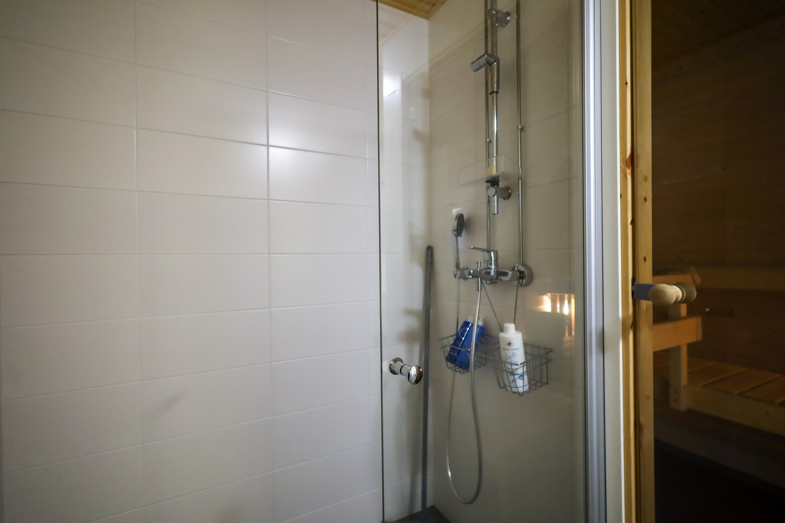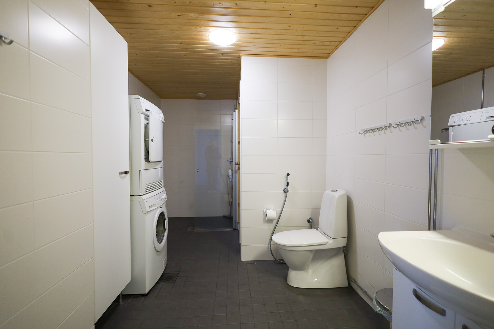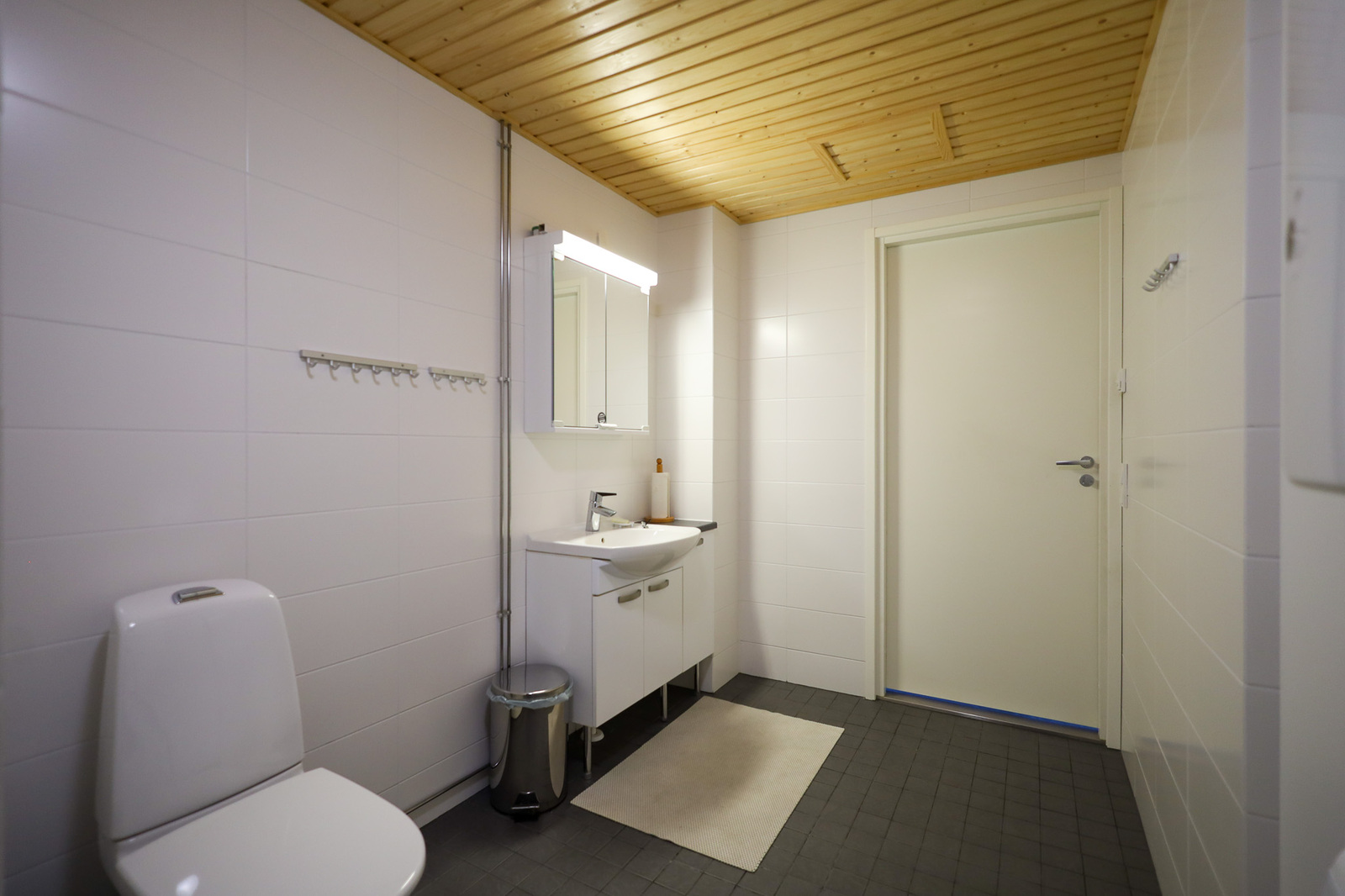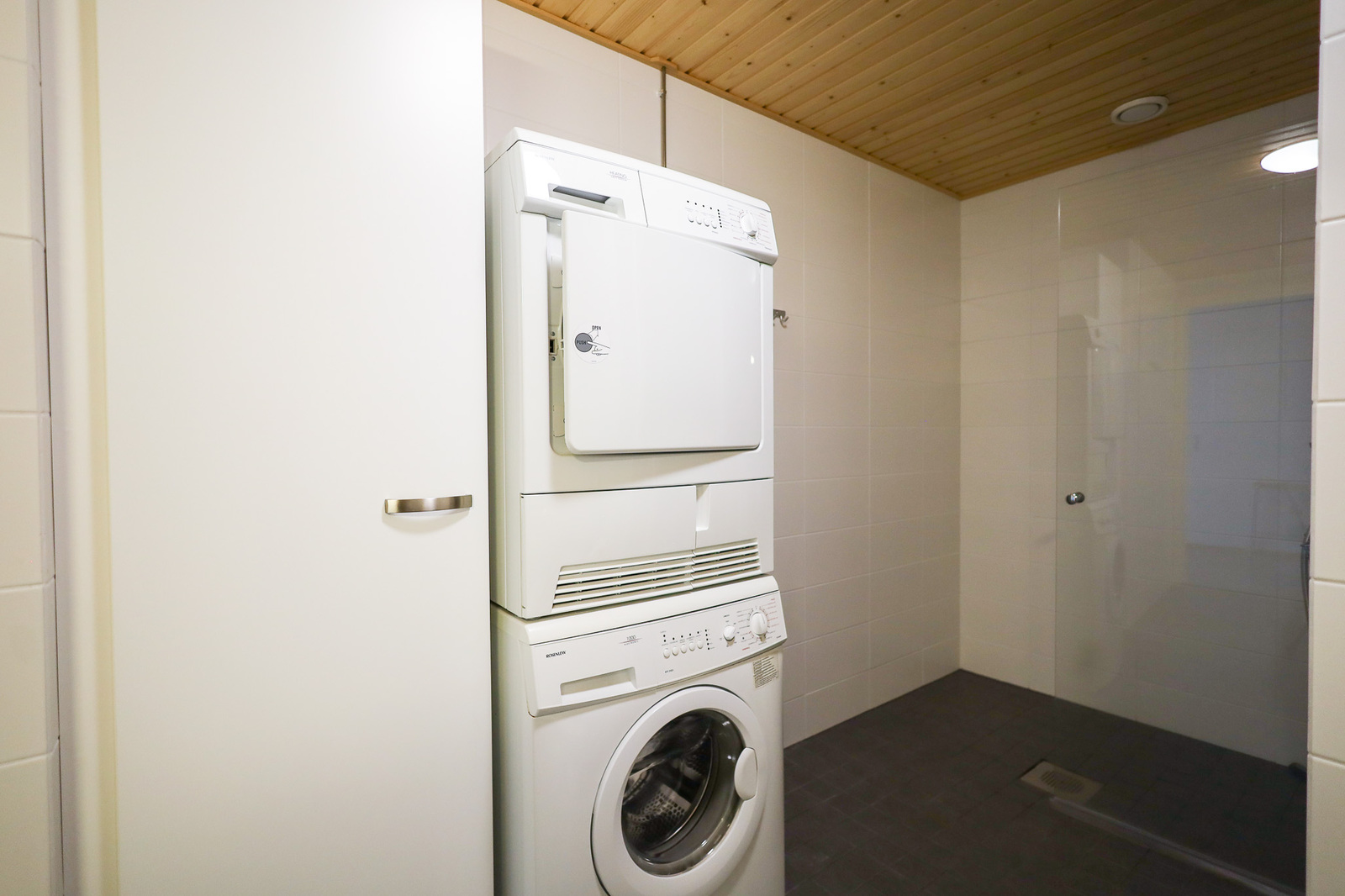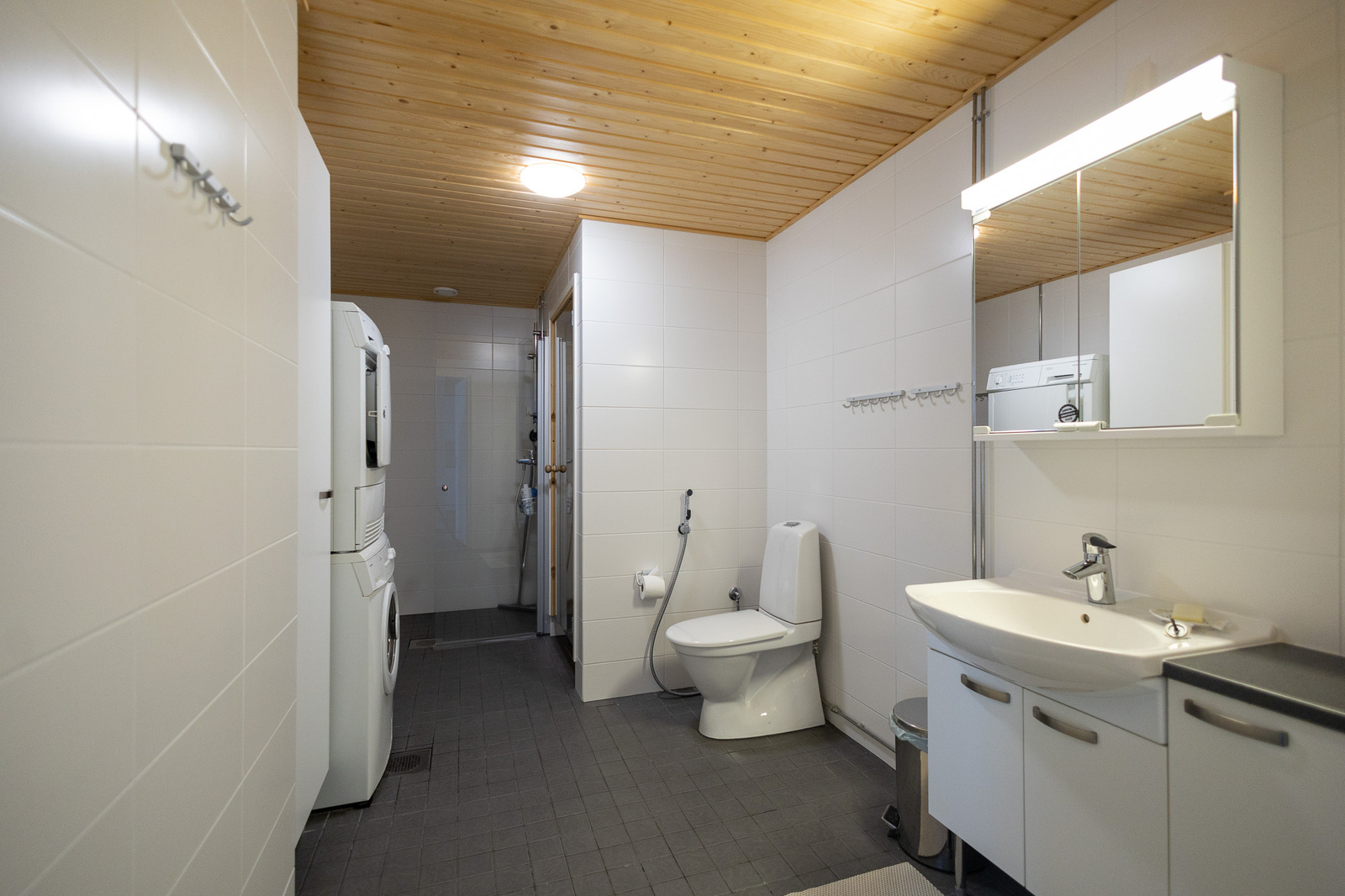 Suihkuseinä, pesukoneliitäntä, lattialämmitys, wc-istuin, suihku, peilikaappi, kylpyhuonekaapisto