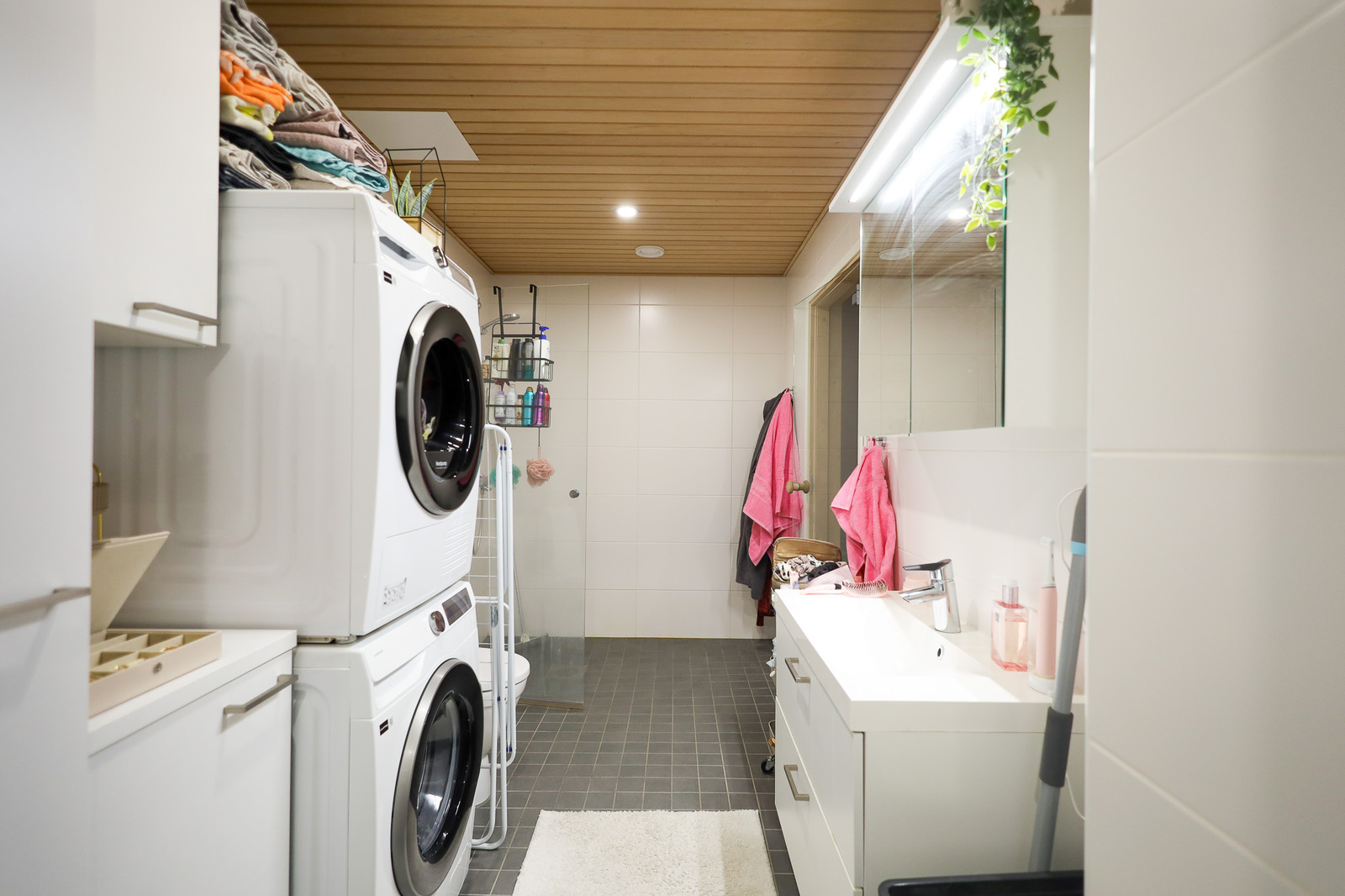 Suihkuseinä, pesukoneliitäntä, lattialämmitys, wc-istuin, suihku, peilikaappi, kiinteät valaisimet
