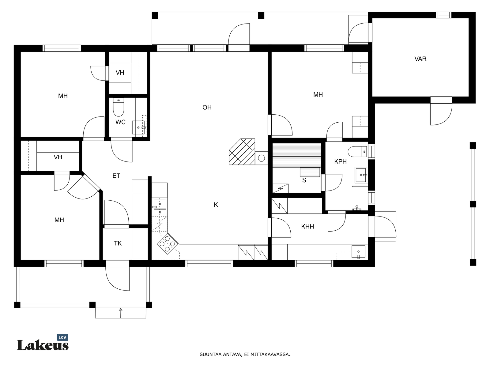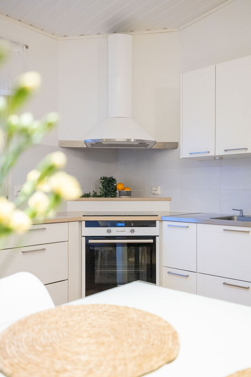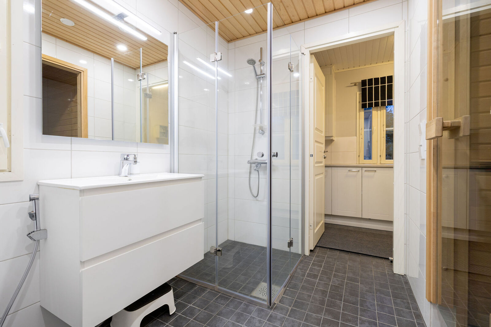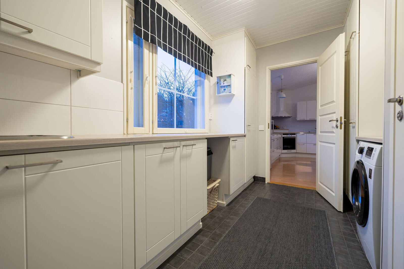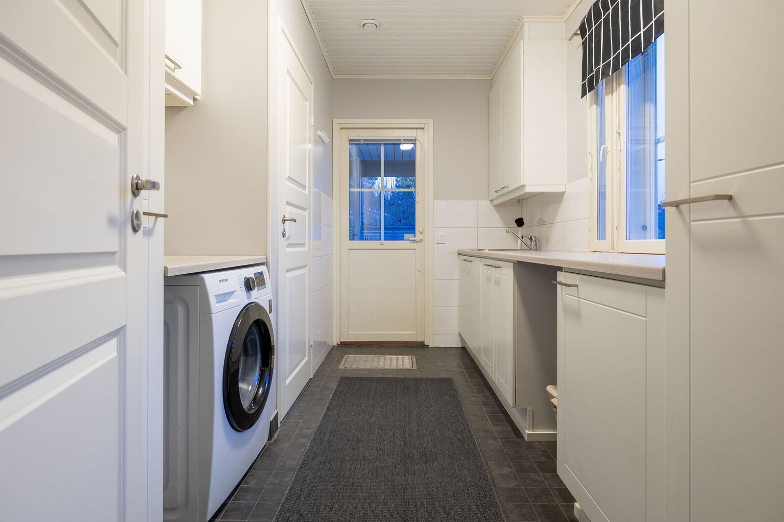 Pesukoneliitäntä, pesuallas, lattialämmitys, lattiakaivo, pyykkikaapit, kurapiste, pöytätaso, keskuspölynimuri