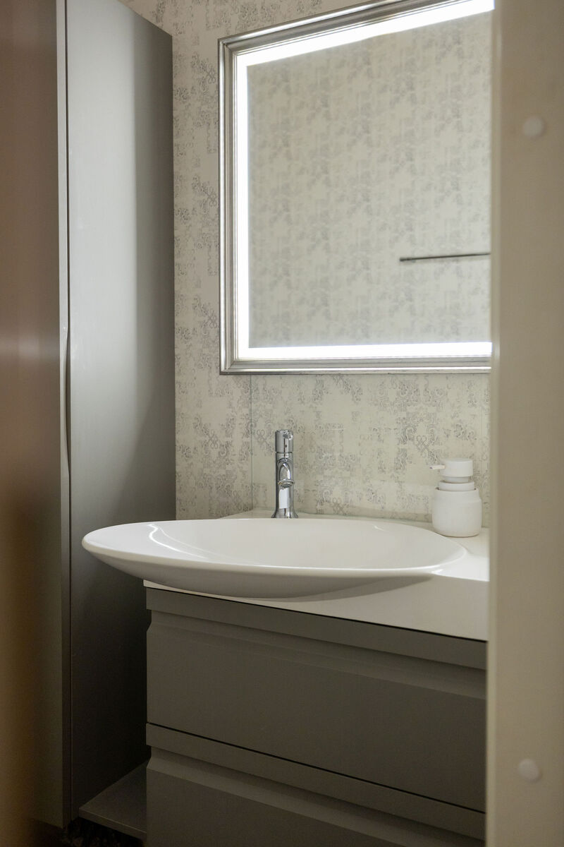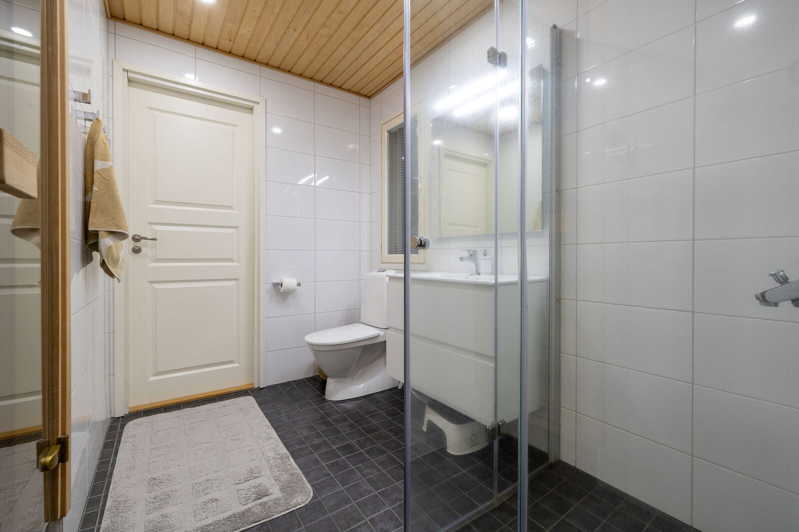 Suihkuseinä, lattialämmitys, wc-istuin, suihku, peili, kylpyhuonekaapisto